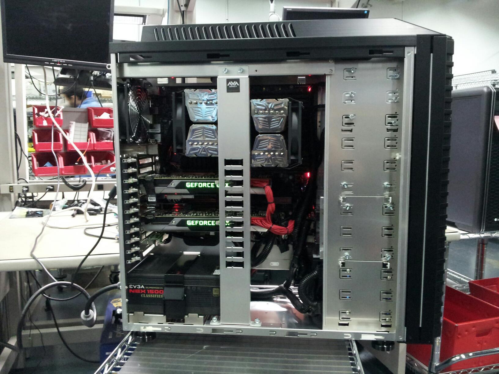 2 x Intel E5-2690 8-jadrový procesor, Prolimatech Megahalems chladič s Dual 120mm NB-Blacknoise SilentPro Fans, EVGA Classified SR-X základná doska, Crucial 96GB DDR3 1600MHz ECC Registered Memory, 2 x EVGA GTX 690 GPUs, 6 x WD 2TB Caviar Black HDDs in IstarUSA BPN-DE340SS Hot Swap Mobile Rack and on LSI 9211-8i RAID Card, Lian Li PC-P80N Case a zdroj EVGA SuperNOVA NEX1500 Classified 1500W.
